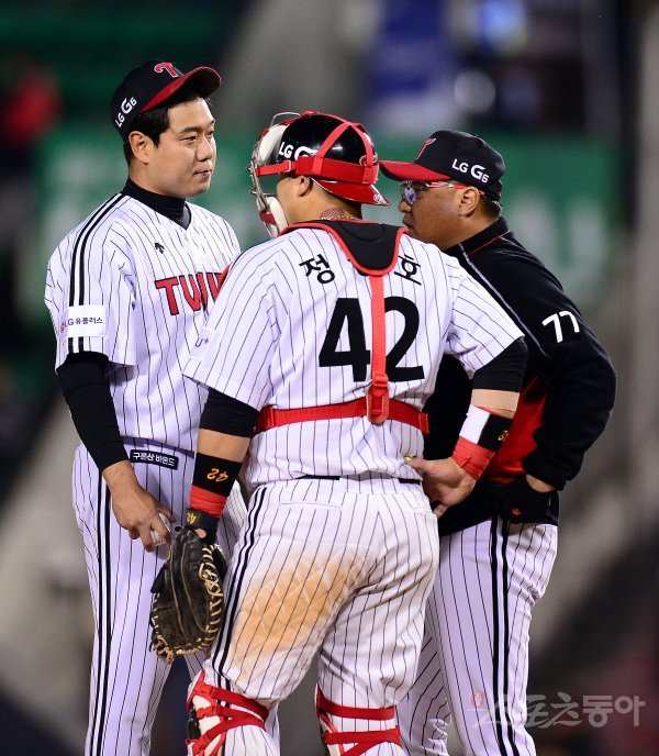 26일 서울 서울 잠실야구장에서 ‘2017 타이어뱅크 KBO 리그’ SK와이번스와 LG트윈스의 경기가 열렸다. 선발 투수로 등판한 LG 류제국이 5회초 안타와 볼넷을 허용하자 강상수 코치가 마운드에 올라 이야기 하고 있다.