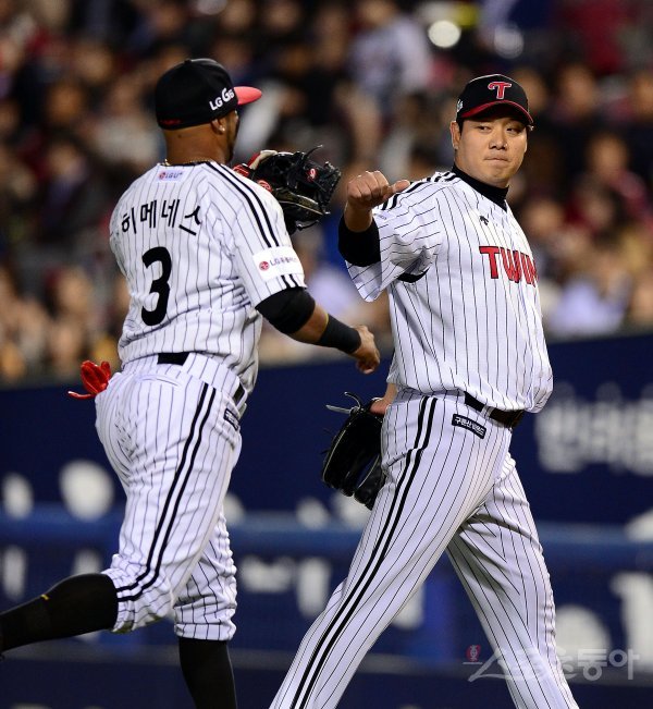 26일 서울 서울 잠실야구장에서 ‘2017 타이어뱅크 KBO 리그’ SK와이번스와 LG트윈스의 경기가 열렸다. 선발 투수로 등판한 LG 류제국이 5회초 2사 1,2루 상황에서 SK 박승욱을 삼진 아웃시킨 후 히메네스와 하이파이브 하고 있다.