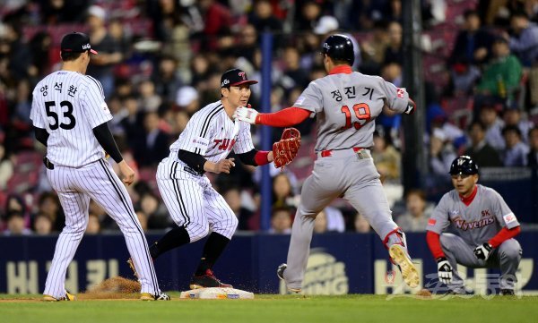 26일 서울 서울 잠실야구장에서 ‘2017 타이어뱅크 KBO 리그’ SK와이번스와 LG트윈스의 경기가 열렸다. 4회초 무사 SK 정진기가 기습번트를 댔으나 1루에서 아웃되고 있다.