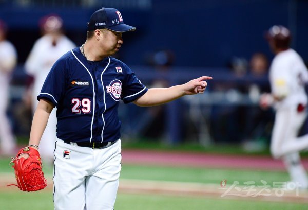 26일 서울 고척스카이돔에서 ‘2017 타이어뱅크 KBO리그’ 넥센 히어로즈와 두산 베어스의 경기가 열렸다. 7회까지 넥센 공격을 무실점으로 막은 두산 선발 유희관이 이닝종료 후 더그아웃으로 들어서고 있다.