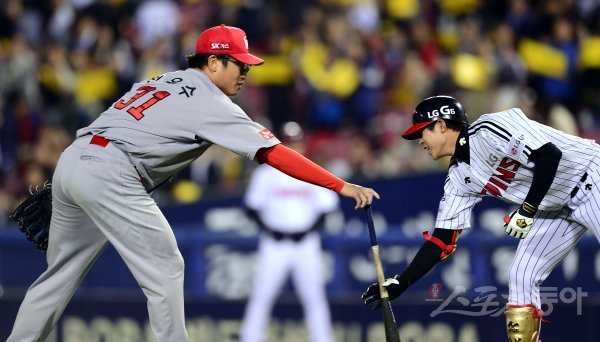 26일 서울 잠실야구장에서 ‘2017 타이어뱅크 KBO 리그’ SK와이번스와 LG트윈스의 경기가 열렸다. 7회말 2사 LG 안익훈이 파울을 치며 배트를 놓치자 SK 전유수가 주워주고 있다.