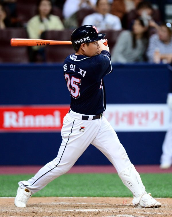 26일 서울 고척스카이돔에서 ‘2017 타이어뱅크 KBO리그’ 넥센 히어로즈와 두산 베어스의 경기가 열렸다. 연장 10회초 2사 2루에서 두산 양의지가 1타점 적시타를 날리고 있다.