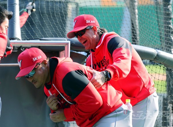27일 잠실야구장에서 ‘2017 타이어뱅크 KBO 리그’ LG트윈스와 SK와이번스의 경기가 열린다. 경기를 앞두고 SK 힐만 감독이 정경배 코치(왼쪽)와 장난을 치고 있다.
