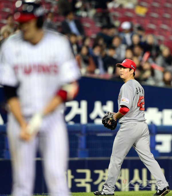 27일 잠실야구장에서 ‘2017 타이어뱅크 KBO 리그’ LG트윈스와 SK와이번스의 경기가 열렸다. 4회말 2사 1,2루에서 SK 선발 문승원이 LG 이형종에게 헤드샷을 허용하며 자동 퇴장을 당하고 있다.