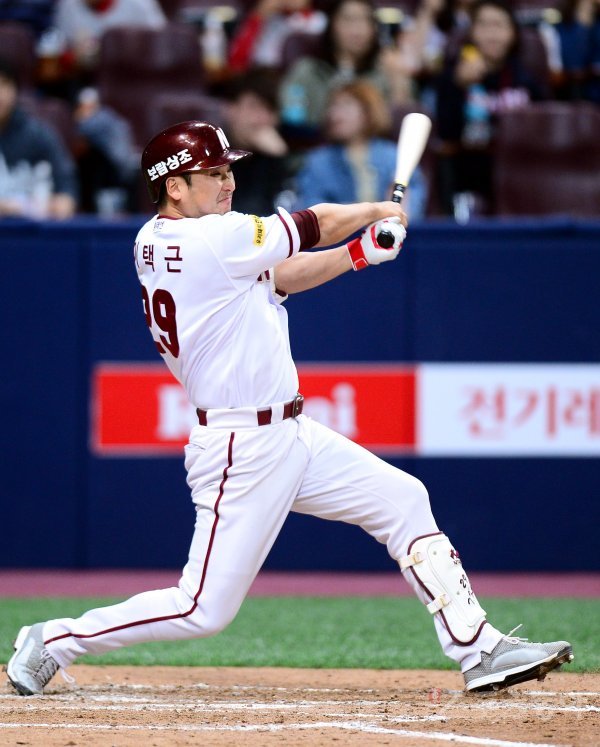 27일 서울 고척스카이돔에서 ‘2017 타이어뱅크 KBO리그’ 넥센 히어로즈와 두산 베어스의 경기가 열렸다. 4회말 1사 1루에서 넥센 이택근이 1타점 2루타를 날리고 있다.