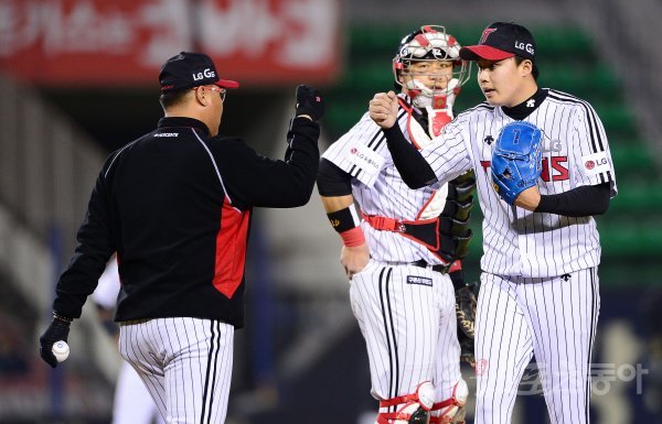 27일 잠실야구장에서 ‘2017 타이어뱅크 KBO 리그’ LG트윈스와 SK와이번스의 경기가 열렸다. 8회초 1사 1루에서 LG 선발 임찬규가 교체되면서 강상수 투수코치와 하이파이브를 하고 있다. 이날 임찬규는 7.1이닝 무실점을 펼치며 승리투수 요건을 갖췄다.