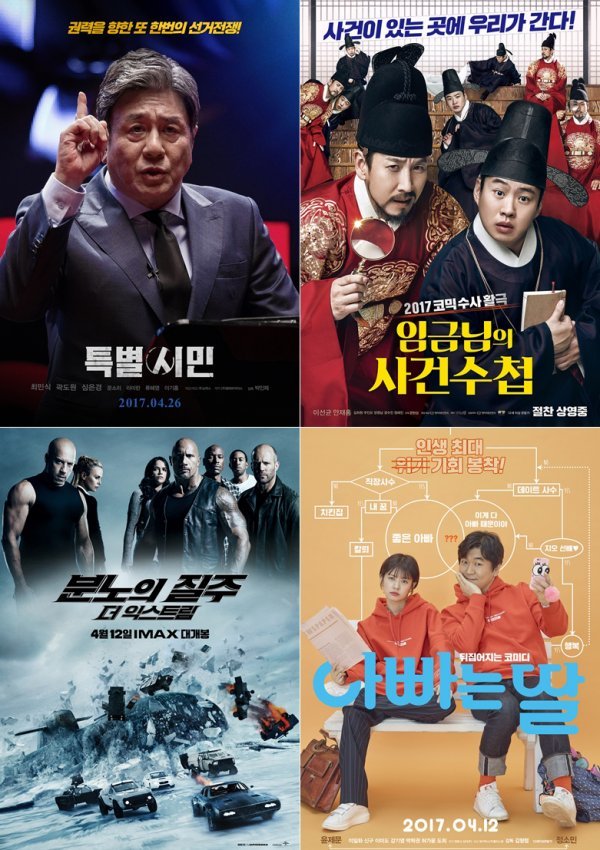 기존 5위를 지켰던 장기 흥행작 ‘미녀와 야수’는 7위로 밀려났다. 4994명의 관객이 찾은 ‘미녀와 야수’의 누적관객수는 505만4948명이다. 관객수는 떨어졌지만 27일에도 231개의 스크린을 확보해 눈길을 끌었다. 다음 주 황금연휴를 노리는 신작들이 개봉하기 전에 주말 관객들을 상대로 마지막 스퍼트에 나선다.