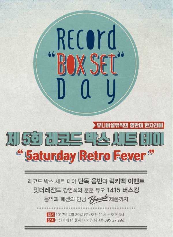 음악 애호가들의 오감을 충족시켜줄 아날로그 감성 프로젝트 2017년 레코드 박스 세트 데이(Record Box Set Day)가 오는 29일 토요일 오전 11시부터 오후 6시까지 서울시 마포구 서교동 다산카페에서 진행된다.
