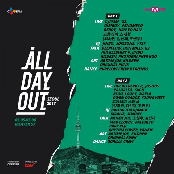 오는 5월 5일에서 6일까지 서울 성수동 ‘레이어 57’에서 개최되는 스트릿 컬쳐 페스티벌 ‘올데이아웃 서울 2017(ALL DAY OUT SEOUL 2017)’(이하 ‘ADO’)이 오늘(28일) 오후 3시 ‘ADO’ 공식 페이스북 및 SNS를 통해 다양한 뮤지션과 크리에이터가 추가된 최종라인업과 타임테이블을 공개하면서 스트릿 컬쳐 마니아들의 뜨거운 관심을 받고 있다.