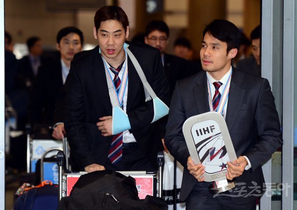 1부리그 승격을 이뤄낸 한국 남자 아이스하키 대표팀이 30일 인천국제공항을 통해 귀국했다. 대표팀 박우상(왼쪽)과 조민호를 비롯한 선수들이 입국장으로 들어서고 있다. 한국 아이스하키 대표팀은 전날 우크라이나에서 막을 내린 ‘2017 국제아이스하키연맹 세계선수권 디비전 1 그룹A(2부리그)에서 준우승을 차지하며 사상 처음으로 월드챔피언십(1부리그)으로 승격됐다.