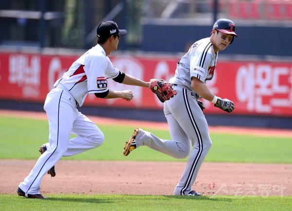 30일 수원kt위즈파크에서 ‘2017 타이어뱅크 KBO 리그’ LG트윈스와 kt위즈의 경기가 열렸다. 2회초 1사 1루 상황에서 1루주자 양석환이 협살에 걸려 아웃되고 있다.