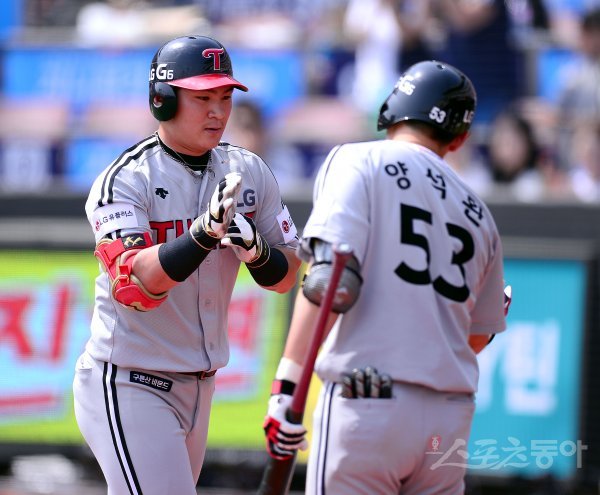30일 수원kt위즈파크에서 ‘2017 타이어뱅크 KBO 리그’ LG트윈스와 kt위즈의 경기가 열렸다. 4회초 무사 LG 오지환이 좌월 솔로 홈런을 날리고 그라운드를 돌아 홈인해 하이파이브 하고 있다.