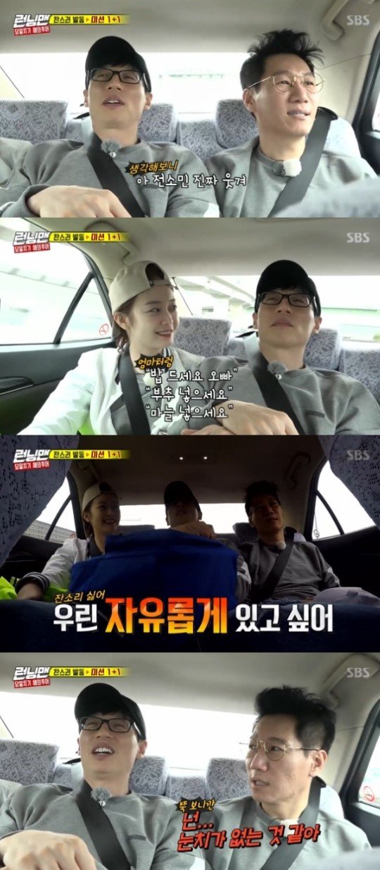 이날 지석진, 유재석은 전소민에게 “진짜 웃긴다. 우리를 케어한다더니…”라며 불만을 터트렸고 이에 전소민이 “제가 챙겨드리지 않았냐”고 답하자 “우린 자유로운 거 좋아한다. 구속하는 것 싫어한다. 넌 눈치가 없는 것 같다”라고 말해 웃음을 자아냈다.