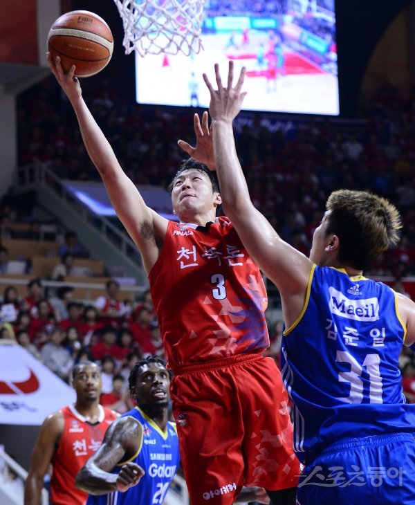 30일 경기도 안양실내체육관에서 열린 ‘2016-2017 KCC 프로농구’ 안양 KGC인삼공사와 서울 삼성의 챔피언결정전 5차전 경기에서 KGC인삼공사 이정현이 삼성 김준일의 수비를 피해 슛을 쏘고 있다.