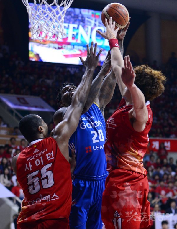 30일 경기도 안양실내체육관에서 열린 ‘2016-2017 KCC 프로농구’ 안양 KGC인삼공사와 서울 삼성의 챔피언결정전 5차전 경기에서 삼성 라틀리프가 KGC인삼공사 사이먼, 양희종의 수비를 피해 슛을 쏘고 있다.