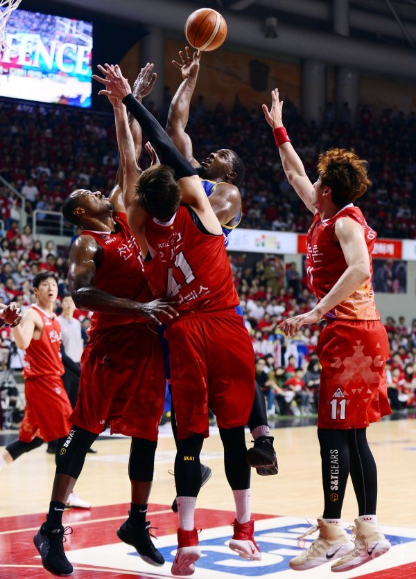30일 경기도 안양실내체육관에서 열린 ‘2016-2017 KCC 프로농구’ 안양 KGC인삼공사와 서울 삼성의 챔피언결정전 5차전 경기에서 삼성 크레익 KGC인삼공사 사이먼, 오세근의 수비를 피해 슛을 쏘고 있다.