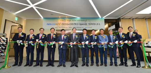 금융지주 계열 은행·증권·보험사가 한 건물에서 금융상품을 제공하는 ‘복합점포’가 뜨고 있다. 금융사 입장에서는 그룹사 간 시너지효과를 극대화할 수 있고, 고객 입장에서는 세밀한 자산운용 상담을 받을 수 있는 장점이 있다. 김용환 NH농협금융지주 회장(왼쪽에서 여섯번째)과 임직원들이 최근 서울 삼성동 소재 ‘NH농협금융PLUS+삼성동금융센터’ 개점식에서 테이프커팅을 하고 있다. 사진제공 l NH농협금융