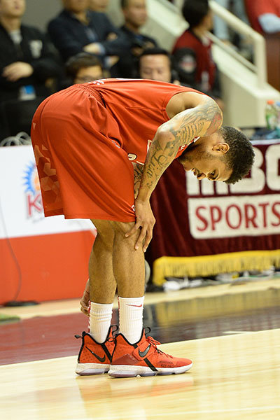 KGC 키퍼 사익스가 22일 안양체육관에서 벌어진 삼성과의 챔프 1차전 도중 다친 왼쪽 발목을 만지고 있다. 결국 KGC는 30일 챔프 5차전에 앞서 사익스를 마이클 테일러로 교체하기로 결정했다. 사진제공 | KBL