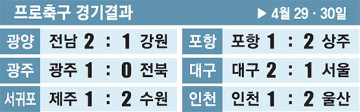 공교롭게도 8라운드에선 유독 이변이 많았다. 이날 광주FC는 개막 7경기 연속무패(5승2무)를 달려온 선두 전북현대를 전반 추가시간 터진 여봉훈의 결승골을 앞세워 1-0으로 꺾었고, 수원삼성도 제주 유나이티드와의 원정경기에서 2-1로 이겨 두 자릿수 승점(11점·2승5무1패)을 신고했다. 전날(29일)에도 전남 드래곤즈가 강원FC를 안방에서 2-1로 잠재웠고, 상주상무 역시 적지에서 포항 스틸러스를 2-1로 눌러 절대강자가 없는 판도를 예고했다.
