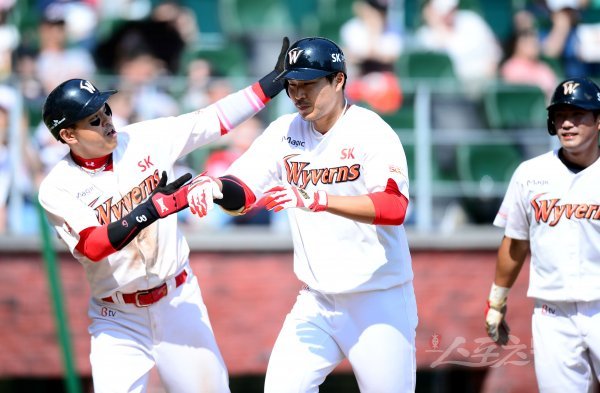3일 인천 SK행복드림구장에서 ‘2017 타이어뱅크 KBO리그’ SK 와이번스와 한화 이글스의 경기가 열렸다. 3회말 무사 1, 2루에서 SK 한동민이 한화 선발 배영수를 상대로 우월 3점 홈런을 쏘아올린 뒤 나주환의 환영을 받고 있다.