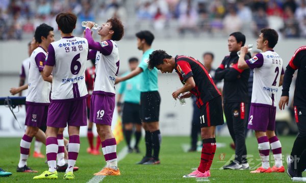 3일 서울월드컵경기장에서 2017 KEB하나은행 K리그 클래식 9라운드 FC서울과 전남드래곤즈의 경기가 열렸다. 후반 FC서울 이석현의 부상으로 양 팀 선수들이 벤치 앞에서 물을 마시고 있다.
