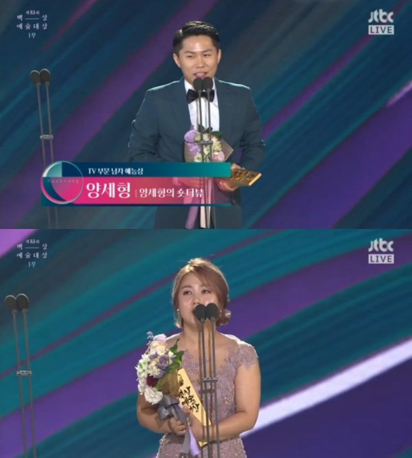 ‘양세형의 숏터부’로 남자 예능상을 양세형은 “원래 자리만 채우려고 했다. 지금도 열심히 개그 아이디어를 짜고 있는 ‘코미디 빅리그’ 동료들께 감사드리며 사랑하는 식구들에게 감사를 드린다”라고엄마에게 감사들 드리고 사랑하는 동생에게도 감사드린다