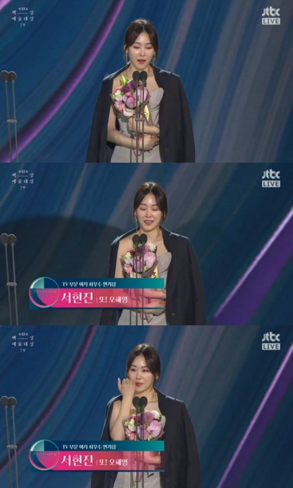 ‘또 오해영’으로 여자 최우수상을 수상한 서현진은 “5월 2일이 ‘또 오해영’이 첫 방송된지 1년이 되는 날이다. 이 드라마로 제게 많은 일들이 있었다. 롤러코스터 탄 기분이어서 아직도 신기하다. 무엇보다 제가 너무 사랑했던 해영이를 훌륭하게 써주신 작가님, 감독님께 감사드린다”라고 말했다.