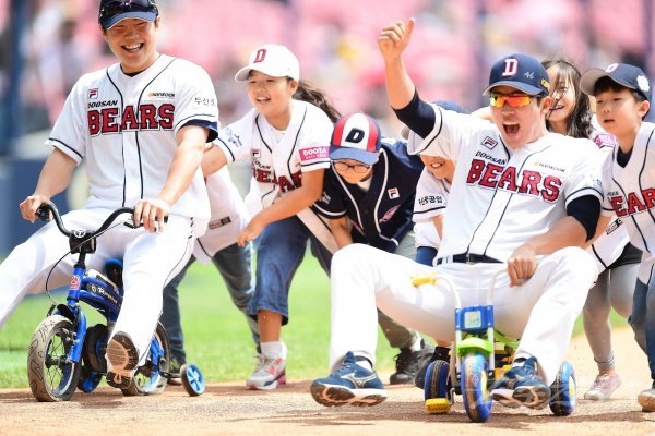 5일 잠실야구장에서 ‘2017 타이어뱅크 KBO 리그’ 두산베어스와 LG트윈스의 경기가 열린다. 경기를 앞두고 열린 어린이날 행사에서 두산 허경민과 류지혁(왼쪽)이 어린이 팬들과 즐거운 시간을 보내고 있다.