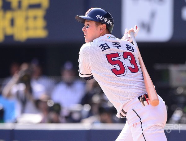 5일 잠실야구장에서 ‘2017 타이어뱅크 KBO 리그’ 두산베어스와 LG트윈스의 경기가 열렸다. 6회말 무사 2루에서 두산 최주환이 적시타를 치고 있다.