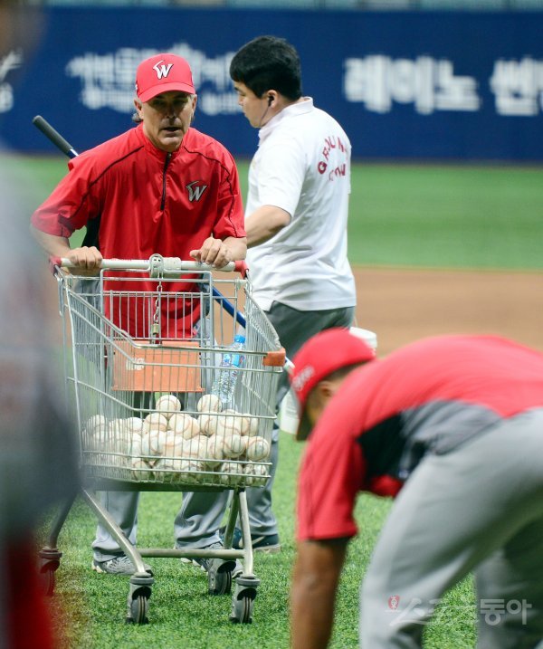 7일 서울 고척스카이돔에서 ‘2017 타이어뱅크 KBO리그’ 넥센 히어로즈와 SK 와이번스의 경기가 열린다. 경기전 SK 힐만 감독이 배팅볼 투수로 변신해 볼을 던진 뒤 정리정돈을 하고 있다.