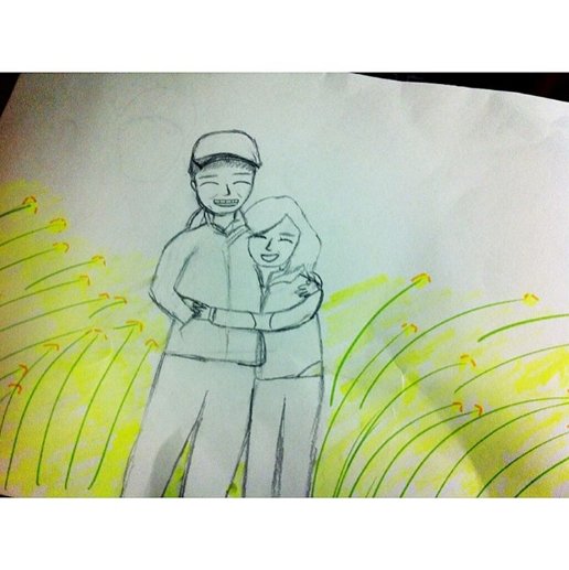 자신이 직접 그린 부모님 모습. 그림 속 부모님은 서로를 꼭 껴안고 포즈를 취했다.