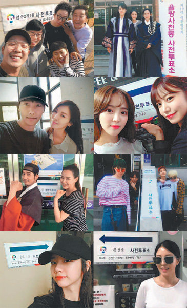 걸스데이의 혜리는 “꼭 투표합시다!”며 투표소 앞에서 찍은 인증샷을 공개했고, 가수 보아도 “절차도 간편해 어렵지 않다. 소중한 한 표 잊지 말고 투표하라”고 독려했다. 유재석 등 MBC 예능프로그램 ‘무한도전’의 멤버 전원, 연기자 이시영, 김의성, 김지훈, 결혼을 앞둔 이상우·김소연 커플 등도 사전투표 행렬에 동참했다.