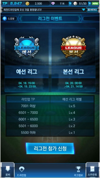 넵튠은 모바일 야구게임 ‘레전드라인업’에 7일 동안 진행하는 ‘리그전’ 이벤트 모드를 추가했다. 14일까지 열리는 리그전은 예선 4일, 본선 3일로 이뤄진 리그 경쟁 콘텐츠다. 예선 리그 기간 중 참가 신청이 가능하다. 예선 종료 후 포인트 현황에 따라 리그 레벨이 변동되며, 이 레벨에 따라 예선 리그 보상 및 본선 리그 레벨이 결정된다. 3일간 열리는 본선 리그는 획득한 누적 포인트에 따라 리그 내 최종 순위가 확정되며 ‘다이아’, ‘팀시설 파츠’, ‘이벤트 코인’ 등을 보상으로 얻을 수 있다.