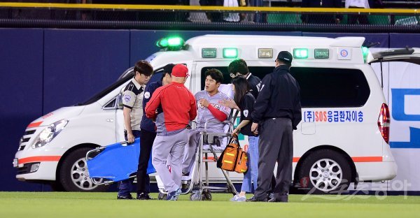 10일 서울 잠실야구장에서 ‘2017 타이어뱅크 KBO 리그’ SK와이번스와 LG트윈스의 경기가 열렸다. 5회말 2사 SK 중견수 조용호가 두산 양의지의 타구를 잡으려다 부상을 당해 엠블런스에 실려 나가고 있다.
