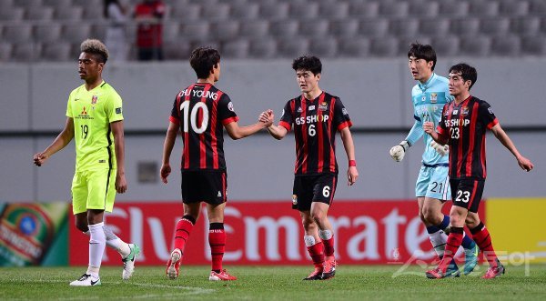 10일 서울월드컵경기장에서 열린 2017 AFC 챔피언스리그 조별리그 F조 6차전 FC서울과 우라와 레즈의 경기에서 FC서울이 1-0 승리를 거두며 원정에서 2-5 대패를 설욕했다. 경기 후 FC서울 선수들이 기쁨을 나누고 있다.