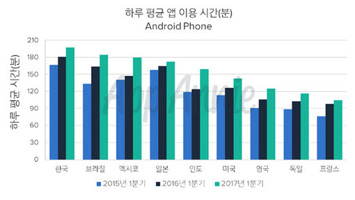 글로벌 앱 분석 업체인 앱애니는 올해 1분기 모바일 앱 사용 현황을 분석한 ‘소비자 앱 사용량 집중 탐구 보고서’를 10일 발표했다. 발표에 따르면 국가별 안드로이드 사용자의 앱 사용 시간을 분석했을 때, 한국 사용자의 하루 평균 총사용 시간은 약200분으로, 전 세계 1위를 차지했다. 브라질과 멕시코, 일본이 그 뒤를 이었다.