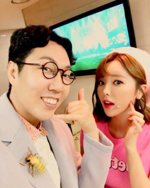 사진 속 홍진영은 ‘따르릉’ 포즈를 취한 김영철과 함께 카메라를 응시하고 있다. 홍진영은 톡톡 튀는 분홍빛 의상과 함께 귀여운 미모를 과시했다. 김영철의 의상에 달려 있는 벌레 장식 또한 눈길을 끈다.