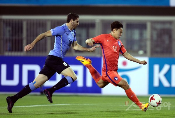 U-20 한국 월드컵 대표팀이 11일 청주 종합운동장에서 우루과이와 평가전을 가졌다. 한국 조영욱이 우루과이 수비수를 제치며 슛을 날리고 있다.