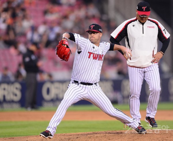 12일 잠실야구장에서 ‘2017 타이어뱅크 KBO 리그’ LG트윈스와 한화이글스의 경기가 열렸다. 3회초 부상으로 팀을 떠나있던 LG 허프가 이닝을 앞두고 마운드에서 연습 투구를 하고 있다.