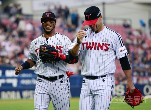 12일 잠실야구장에서 ‘2017 타이어뱅크 KBO 리그’ LG트윈스와 한화이글스의 경기가 열렸다. 3회초 이닝을 마친 후 LG 히메네스가 더그아웃으로 들어가는 허프(오른쪽)을 보며 미소를 짓고 있다.