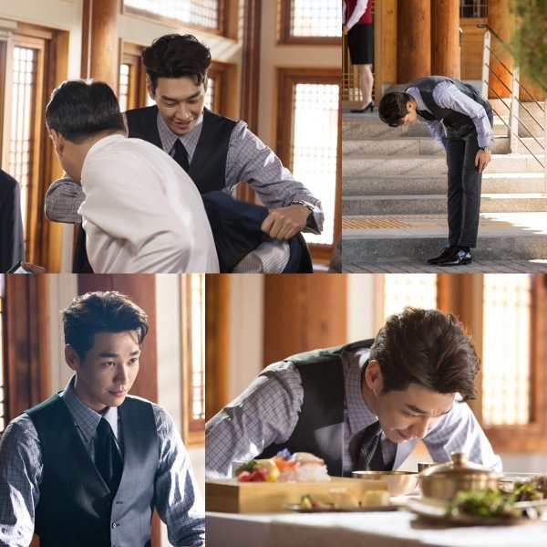 또 다른 사진 속 김영광의 허리는 펴질 틈이 없다. 테이블과 맞닿을 듯 숙여진 고개, 90도 폴더인사의 정석을 보여주는 듯한 모습들이 포착된 것. 속물검사 장도한의 면모, 이를 능구렁이처럼 표현하고 있는 김영광의 연기가 흥미진진함을 더하고 있다.