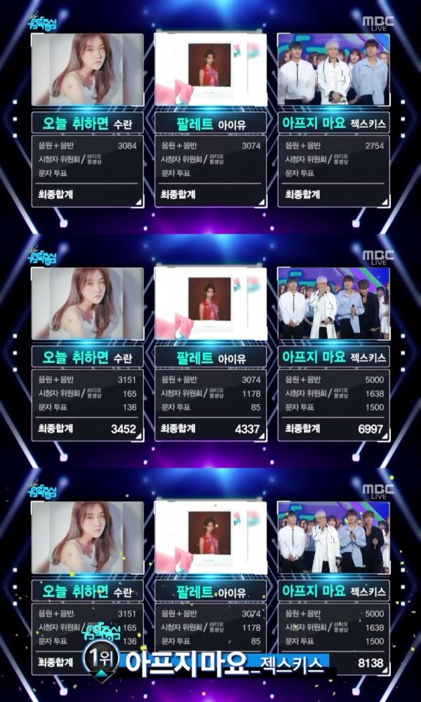 13일 오후 방송된 MBC ‘쇼! 음악중심’(이하 ‘음악중심’)에서는 수란의 \'오늘 취하면\'과 아이유의 \'팔레트\', 젝스키스의 \'아프지마요\'가 1위 후보에 올랐다.