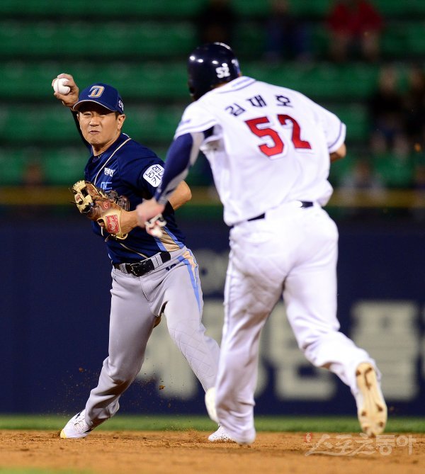 16일 서울 잠실야구장에서 ‘2017 타이어뱅크 KBO 리그’ NC다이노스와 두산베어스의 경기가 열렸다. 5회말 1사 1루 두산 민병헌 내야 땅볼 때 NC 손시헌이 1루주자 김재호를 포스 아웃시킨 후 1루로 송구하고 있다.