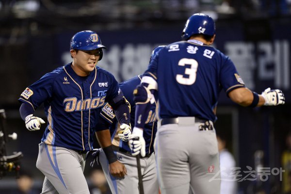 16일 서울 잠실야구장에서 ‘2017 타이어뱅크 KBO 리그’ NC다이노스와 두산베어스의 경기가 열렸다. 4회초 무사 1루 NC 권희동이 좌월 투런 홈런을 날린 후 그라운드를 돌아 홈인해 하이파이브 하고 있다.