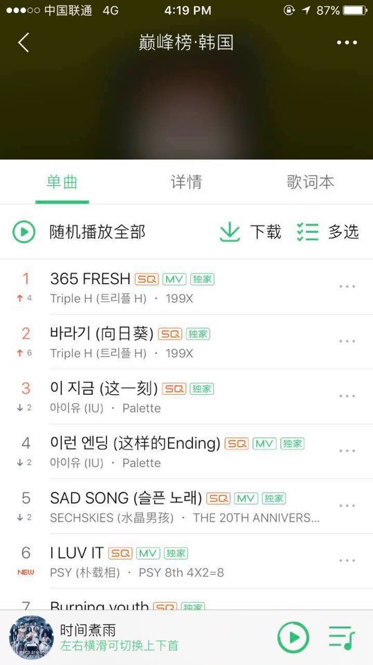 트리플 H가 1위를 차지한 QQ뮤직의 k팝 차트에는 아이유의 '이 지금'과 '이런 엔딩'이 3,4위, 젝스키스의 '슬픈노래'가 5위, 싸이의 신곡 'I LUV IT'이 6위에 올랐다.