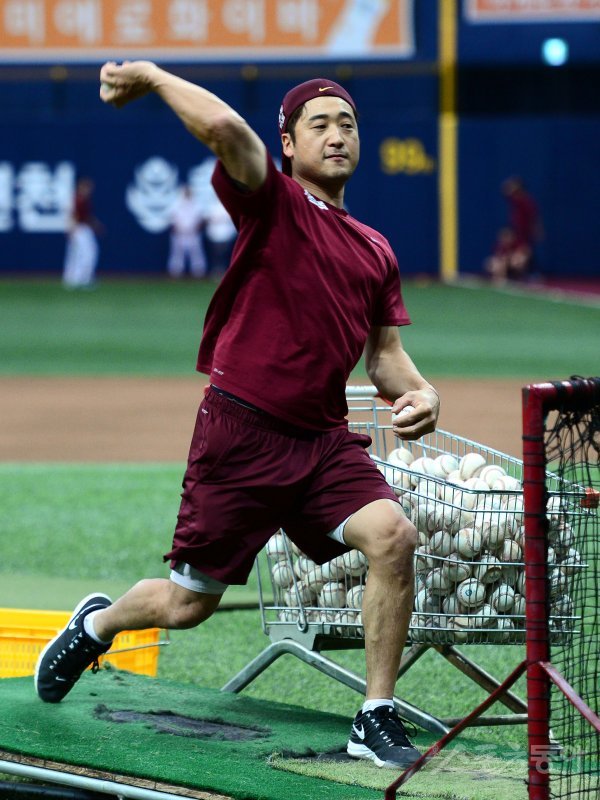 17일 서울 고척스카이돔에서 ‘2017 타이어뱅크 KBO리그’ 넥센 히어로즈와 한화 이글스의 경기가 열린다. 경기전 넥센 이택근이 배팅볼 투수로 변신해 볼을 던지고 있다.