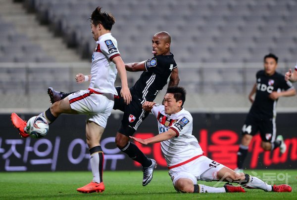 17일 서울월드컵경기장에서 2017 KEB 하나은행 FA컵 16강전 FC서울과 부산아이파크의 경기가 열렸다. 전반 부산아이파크 루키안(가운데)이 FC서울 황현수와 김원식(오른쪽)의 마크를 앞에 두고 슈팅을 때리고 있다.