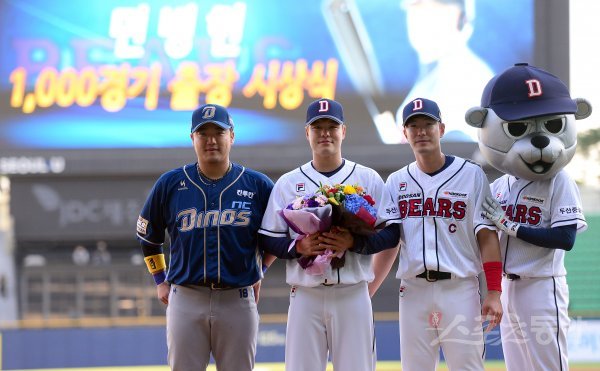 17일 서울 잠실야구장에서 ‘2017 타이어뱅크 KBO 리그’ NC다이노스와 두산베어스의 경기가 열렸다. 경기 전 두산 민병헌의 1,000경기 출장 기념 시상식이 진행되고 있다. 민병헌 이 박석민, 김재호와 기념 촬영을 하고 있다.