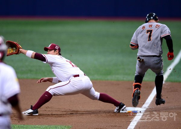 17일 서울 고척스카이돔에서 ‘2017 타이어뱅크 KBO리그’ 넥센 히어로즈와 한화 이글스의 경기가 열렸다. 1회초 2사에서 한화 송광민이 내야안타로 출루하고 있다.