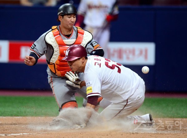 17일 서울 고척스카이돔에서 ‘2017 타이어뱅크 KBO리그’ 넥센 어로즈와 한화 이글스의 경기가 열렸다. 8회말 2사 1루에서 넥센 채태인의 2루타 때 1루주자 고종욱이 3루까지 진루한 뒤 상대 송구 실책으로 득점에 성공하고 있다.